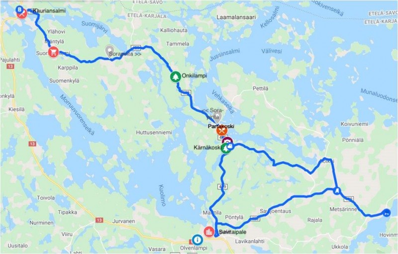 * Six kilometers from Partakoski to Mikkeli a signpost to the right leads to Onkilampi with a lean-to shelter, a campfire site, toilets and a dock for swimming. It offers also the opportunity to try the hiking trail Orrainpolku. At Suomenniemi there is one more rest place along the road, an observation tower with a lean-to shelter and a campfire. The path up to the tower begins about 1 km from the highway.